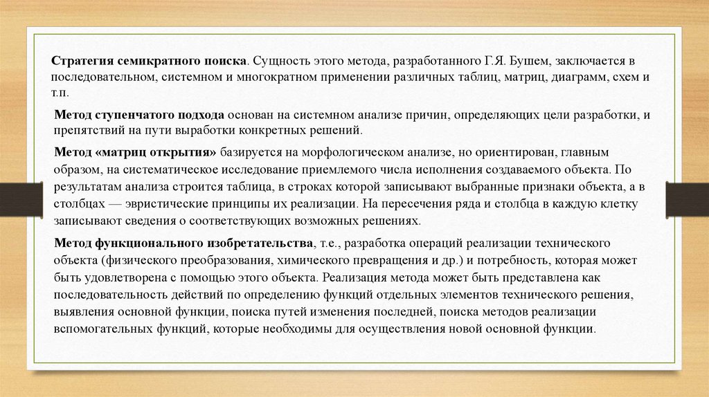 Стратегия семикратного поиска. Сущность этого метода, разработанного Г.Я. Бушем, заключается впоследовательном, системном и многократном применении различных таблиц, матриц, диаграмм, схем и