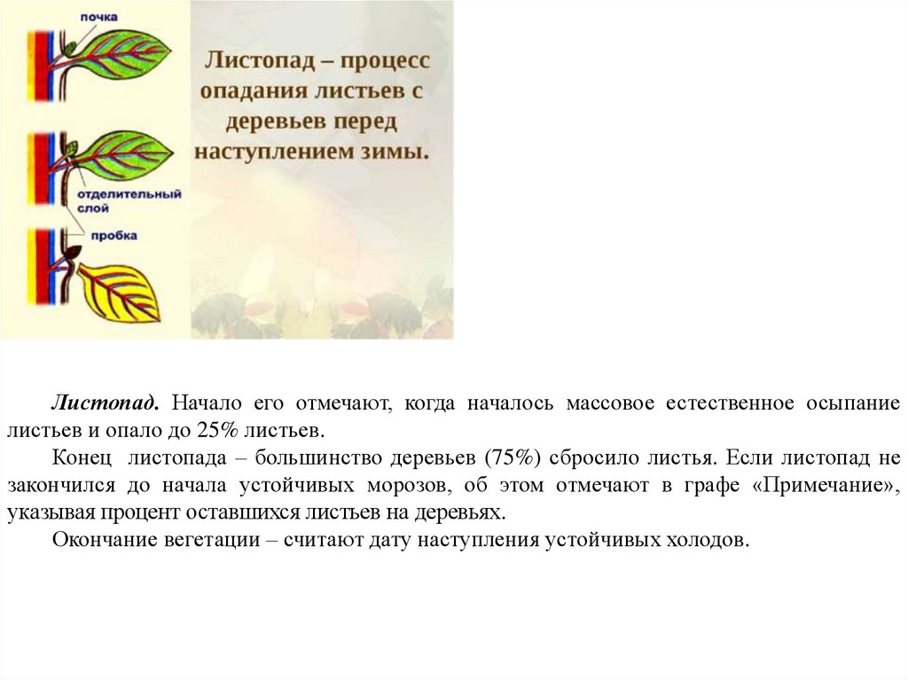 Листопад. Начало его отмечают, когда началось массовое естественное осыпаниелистьев и опало до 25% листьев.