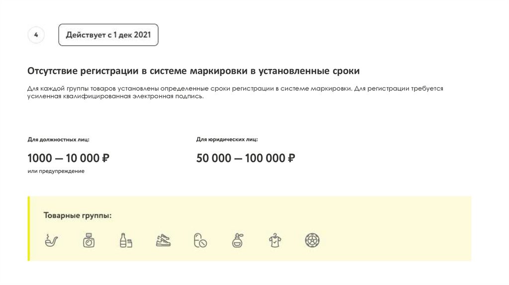 Отсутствие регистрации в системе маркировки в установленные срокиДля каждой группы товаров установлены определенные сроки регистрации в системе маркировки. Для регистрации требуется