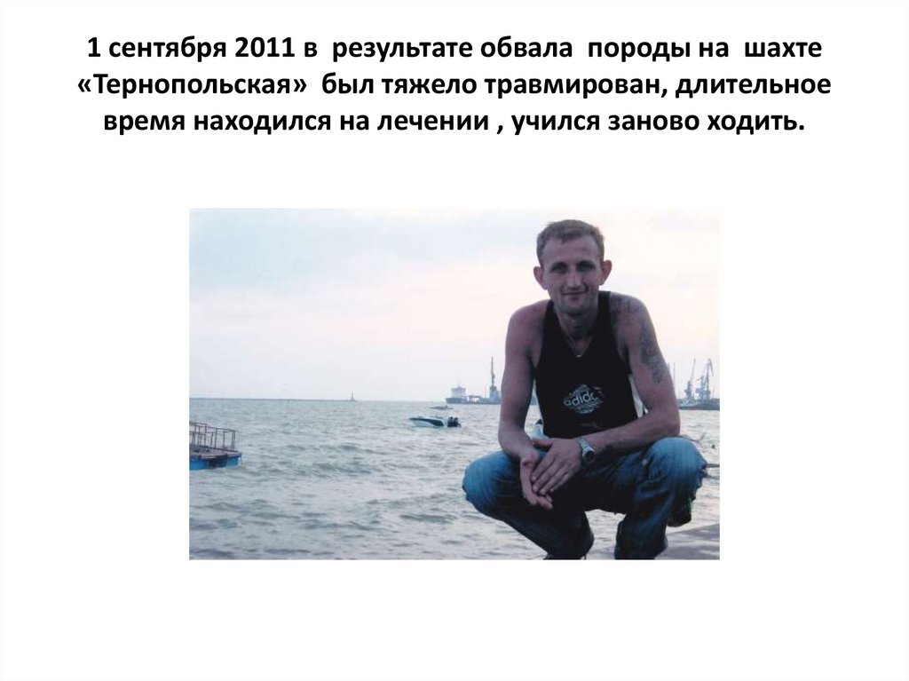 1 сентября 2011 в результате обвала породы на шахте«Тернопольская» был тяжело травмирован, длительное