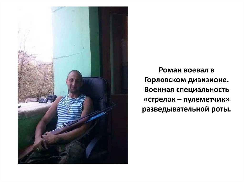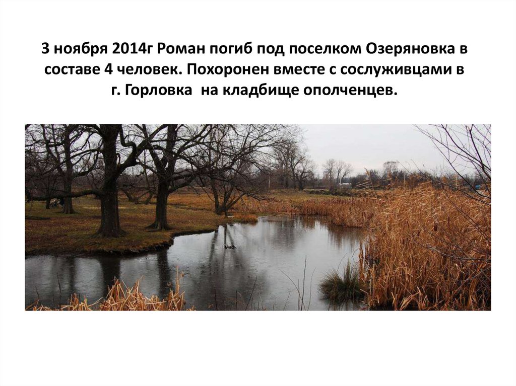3 ноября 2014г Роман погиб под поселком Озеряновка всоставе 4 человек. Похоронен вместе с сослуживцами в