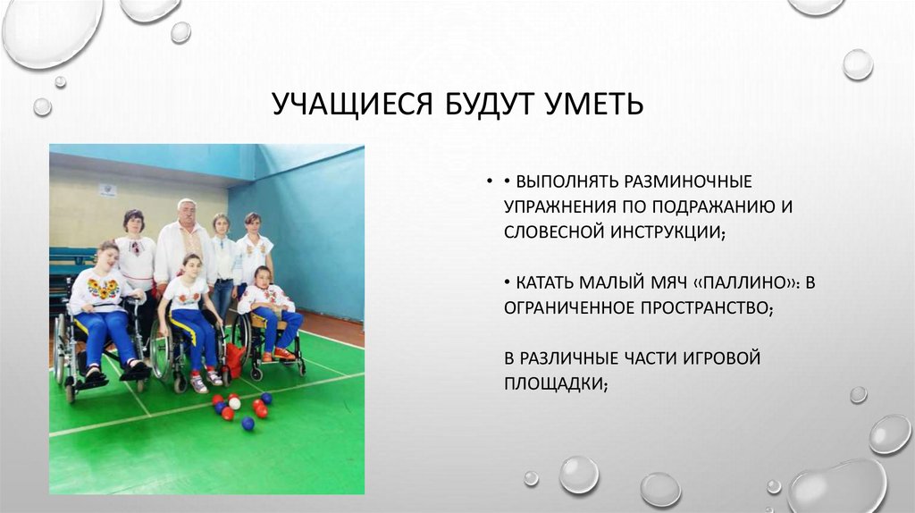 УЧАЩИЕСЯ БУДУТ УМЕТЬ• • ВЫПОЛНЯТЬ РАЗМИНОЧНЫЕ