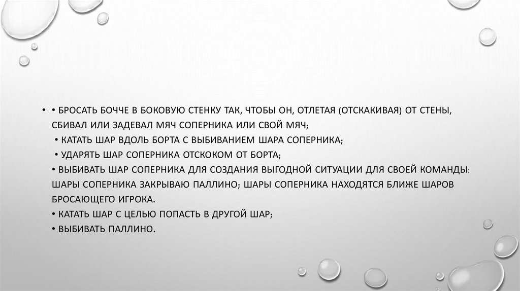 • • БРОСАТЬ БОЧЧЕ В БОКОВУЮ СТЕНКУ ТАК, ЧТОБЫ ОН, ОТЛЕТАЯ (ОТСКАКИВАЯ) ОТ СТЕНЫ,СБИВАЛ ИЛИ ЗАДЕВАЛ МЯЧ СОПЕРНИКА ИЛИ СВОЙ МЯЧ;