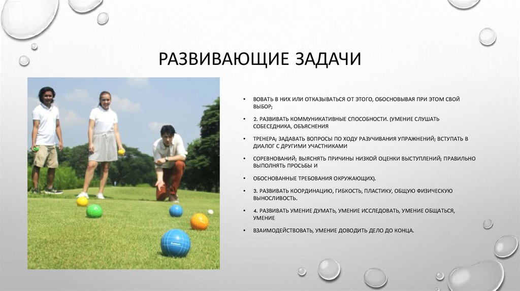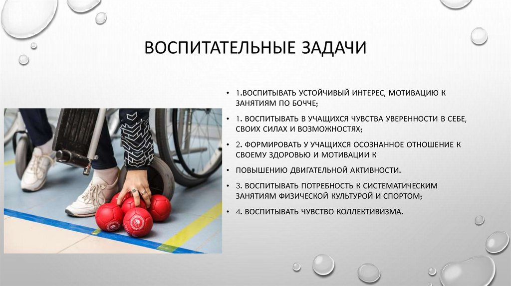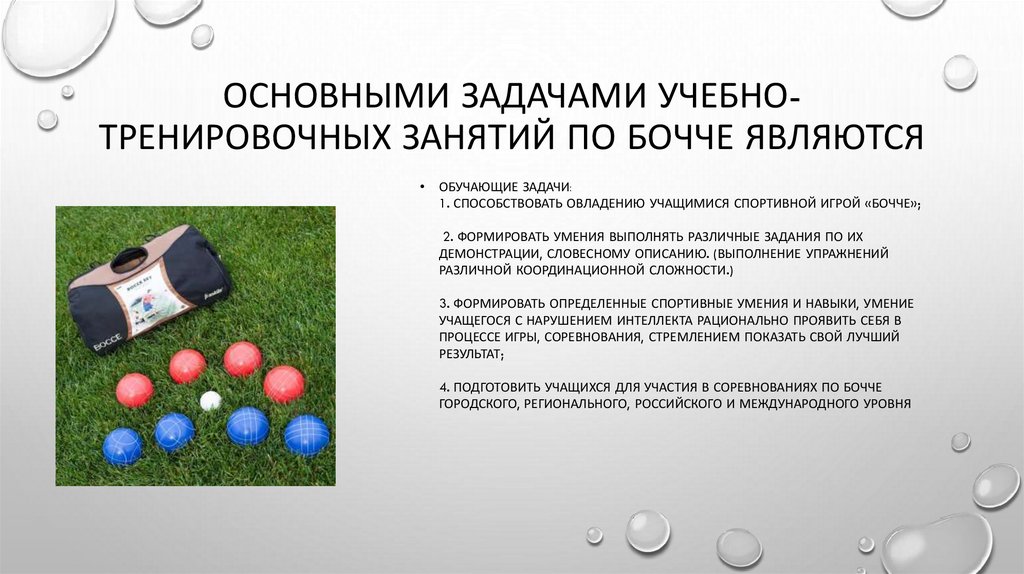 ОСНОВНЫМИ ЗАДАЧАМИ УЧЕБНОТРЕНИРОВОЧНЫХ ЗАНЯТИЙ ПО БОЧЧЕ ЯВЛЯЮТСЯОБУЧАЮЩИЕ ЗАДАЧИ: