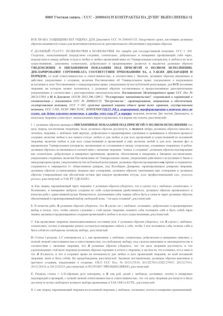 800# Учетная запись : UCC - 2000043135 КОНТРАКТЫ НА ДУШУ ВЫПОЛНЕНЫ #2ВСЕ ПРАВА ЗАЩИЩЕНЫ БЕЗ УЩЕРБА ДЛЯ Документа UCC № 2000043135, бессрочного срока, настоящим должным