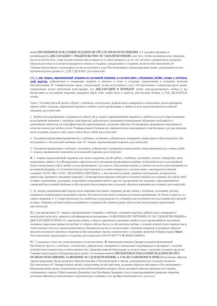 выше ПИСЬМЕННОЕ ПОКАЗАНИЕ ПОД ПРИСЯГОЙ О ПОЛНОМ ИСПОЛНЕНИИ. и 1 сделайте проверку иратифицируйте ДЕКЛАРАЦИЯ О СВИДЕТЕЛЬСТВЕ ОБ УДОВЛЕТВОРЕНИИ, для того, чтобы вселенная всего творения