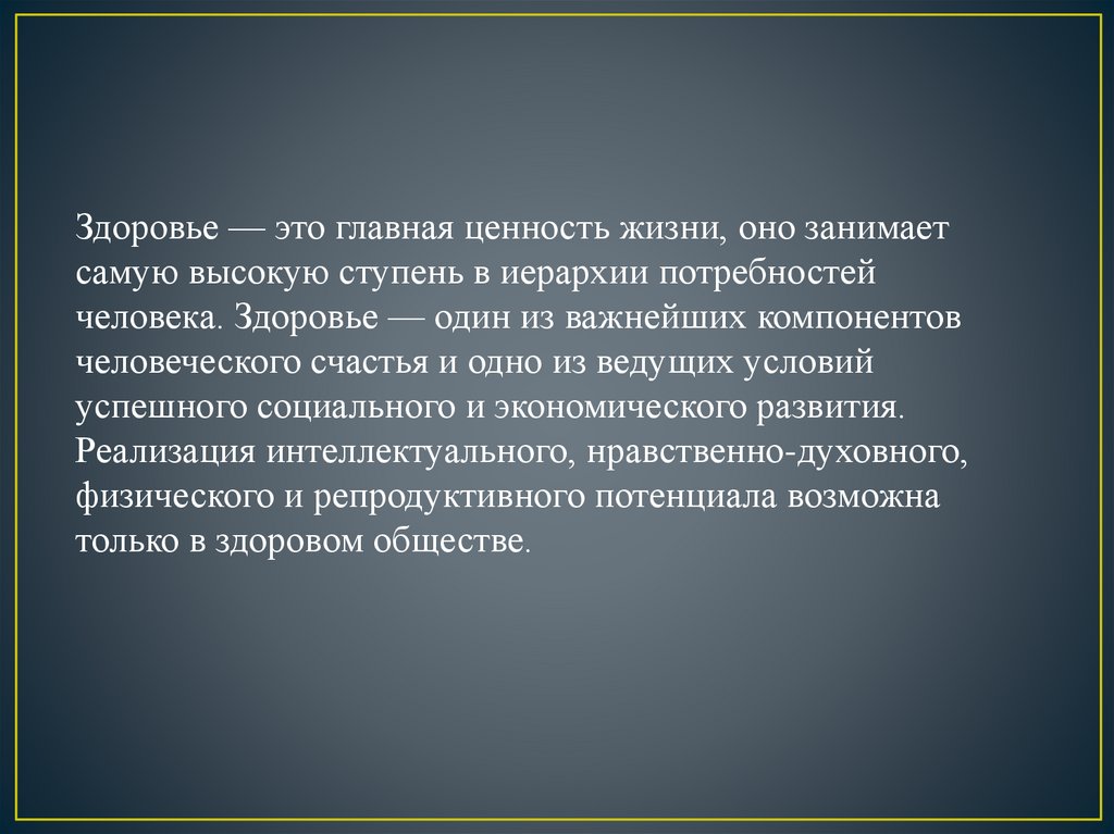 Здоровье — это главная ценность жизни, оно занимаетсамую высокую ступень в иерархии потребностей