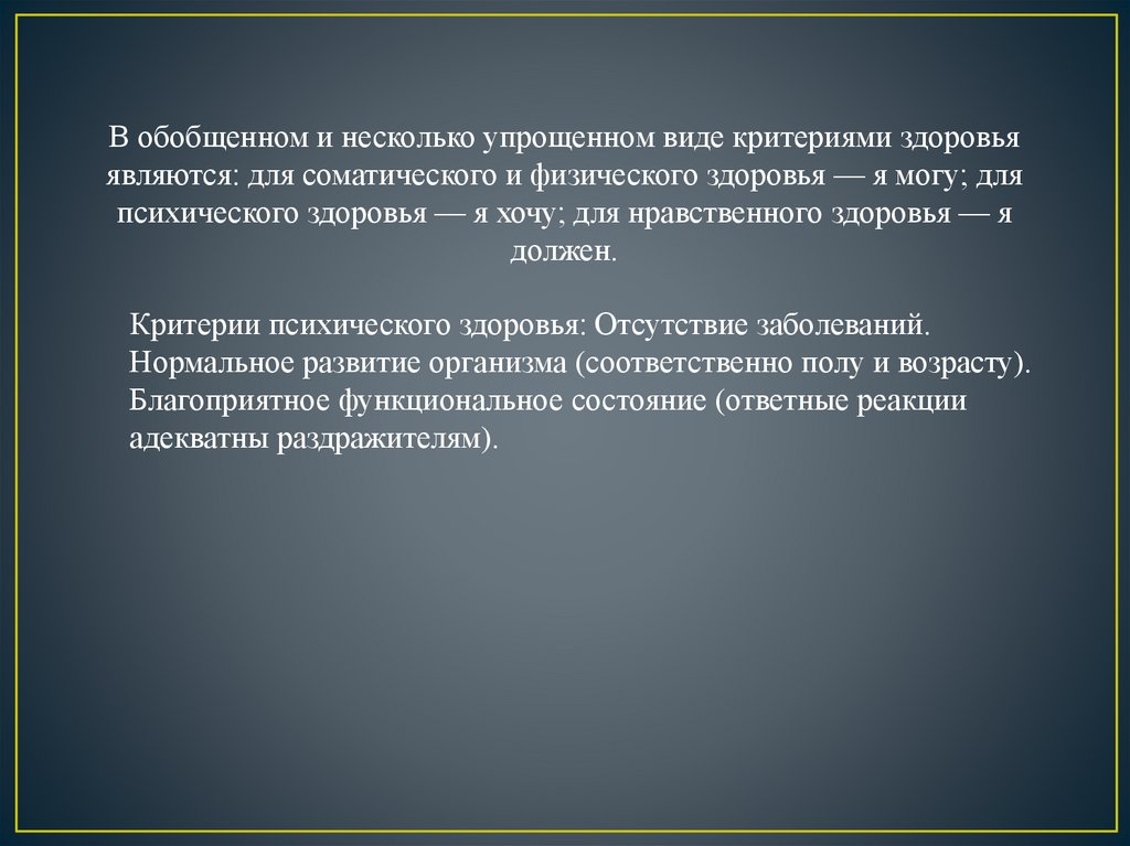 В обобщенном и несколько упрощенном виде критериями здоровьяявляются: для соматического и физического здоровья — я могу; для
