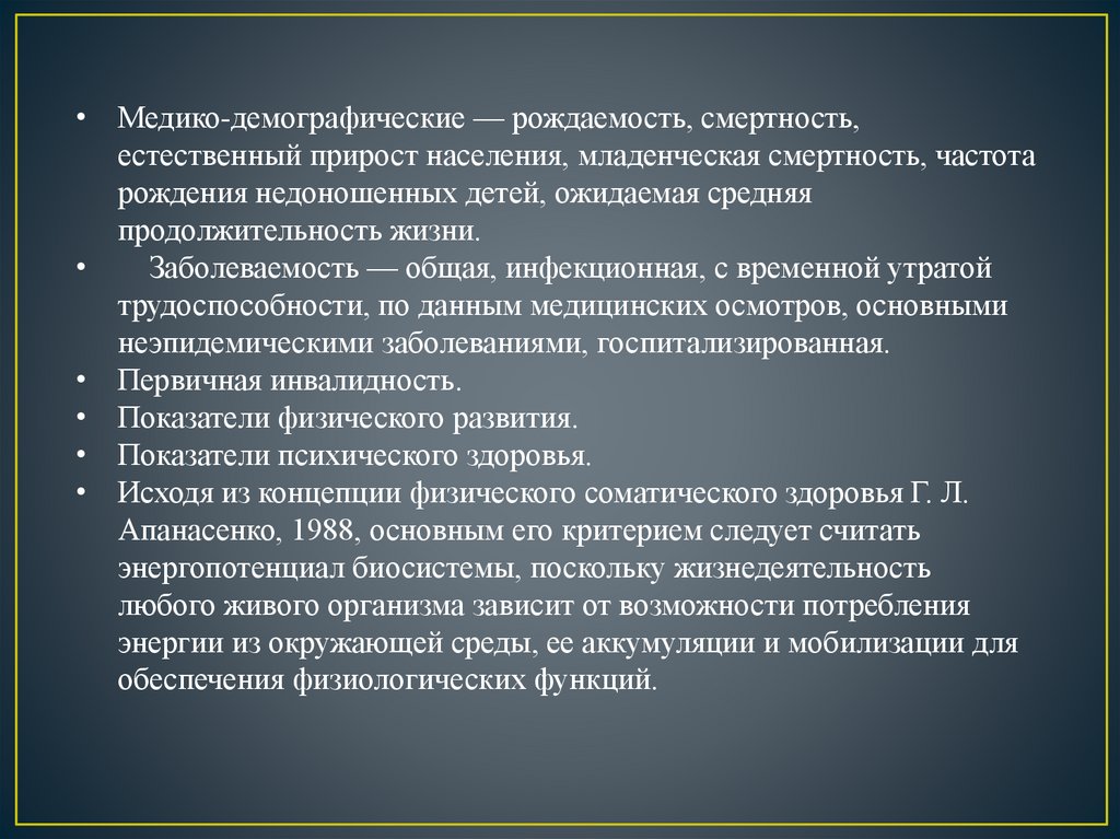 • Исходя из концепции физического соматического здоровья Г. Л.