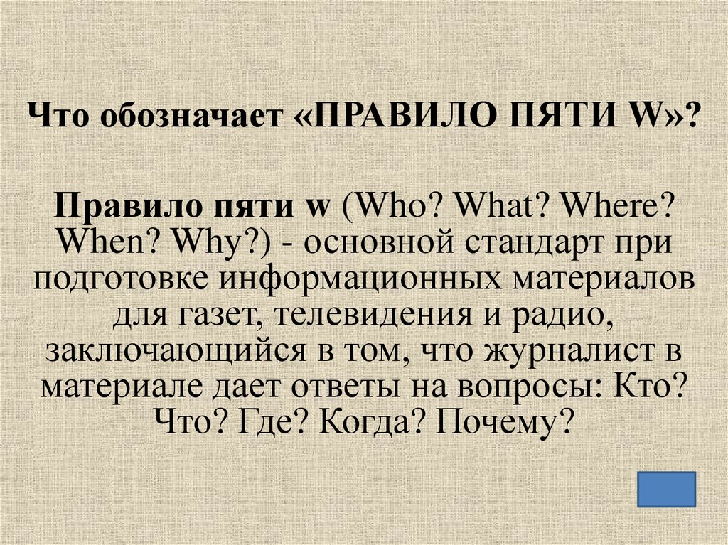Что обозначает «ПРАВИЛО ПЯТИ W»?Правило пяти w (Who? What? Where?