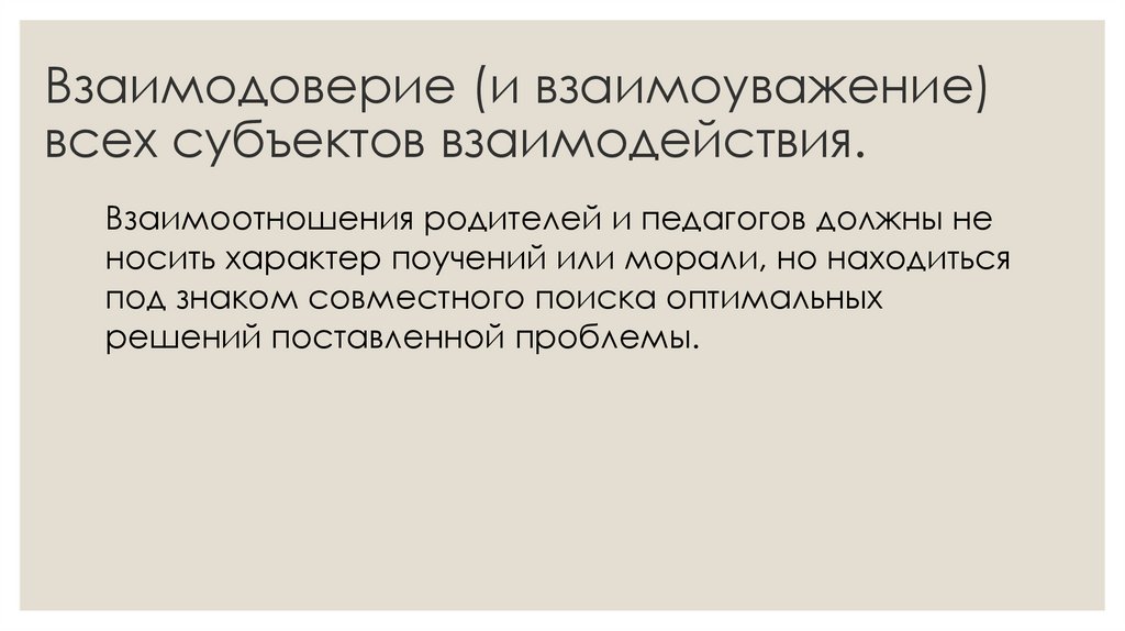◦ Взаимодоверие (и взаимоуважение) всех субъектов взаимодействия