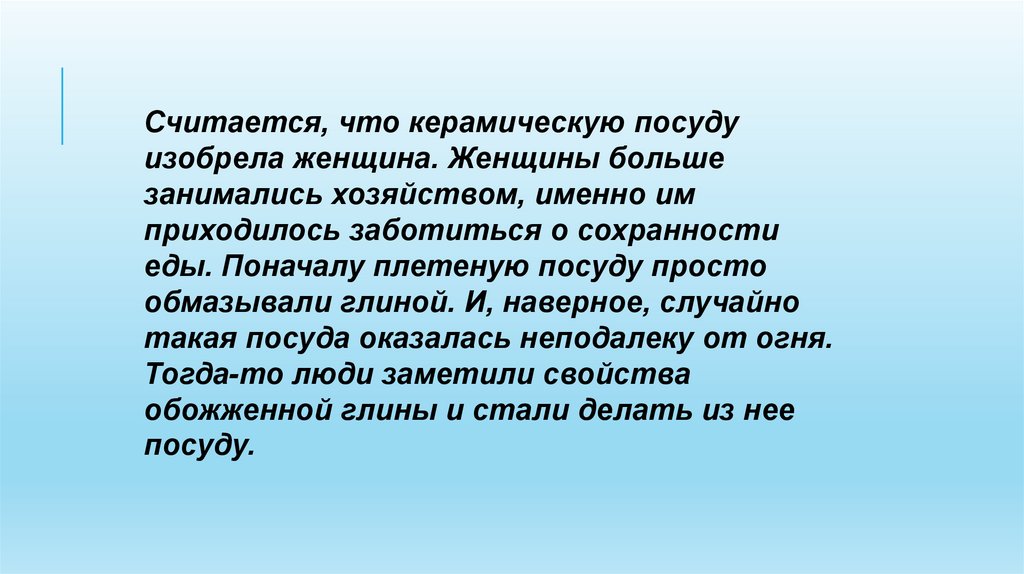 Считается, что керамическую посудуизобрела женщина. Женщины больше