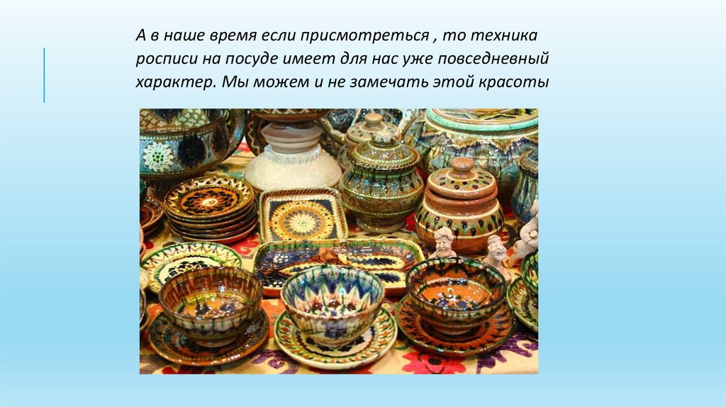 А в наше время если присмотреться , то техникаросписи на посуде имеет для нас уже повседневный
