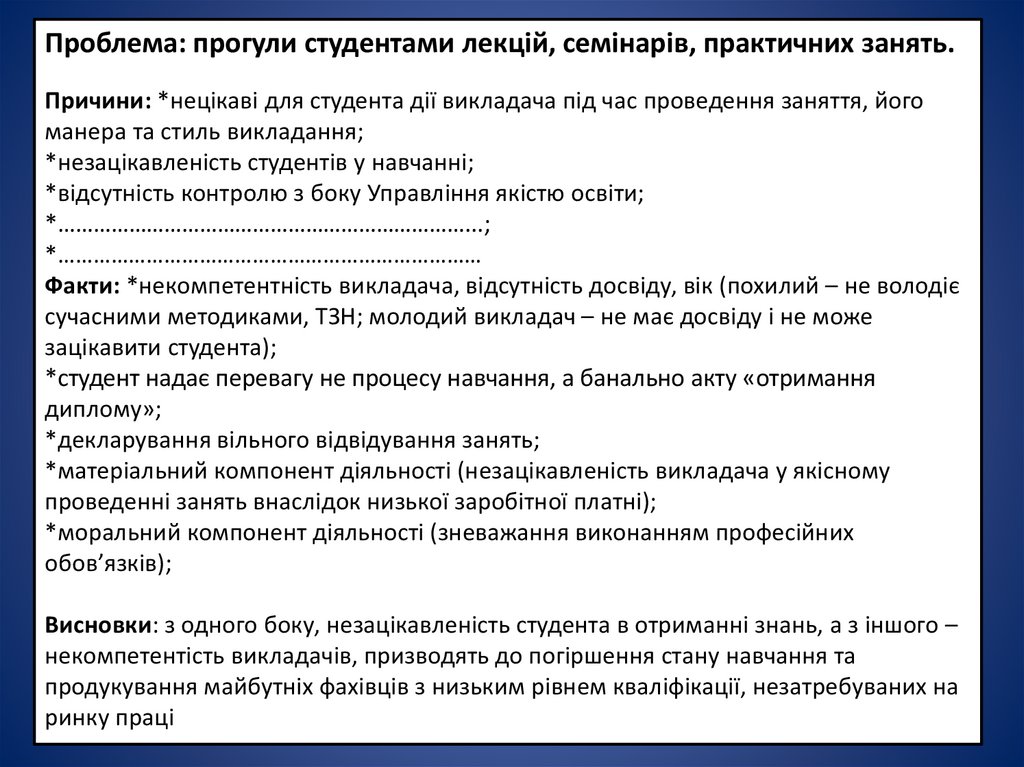 Проблема: прогули студентами лекцій, семінарів, практичних занять.Причини: *нецікаві для студента дії викладача під час проведення заняття, його