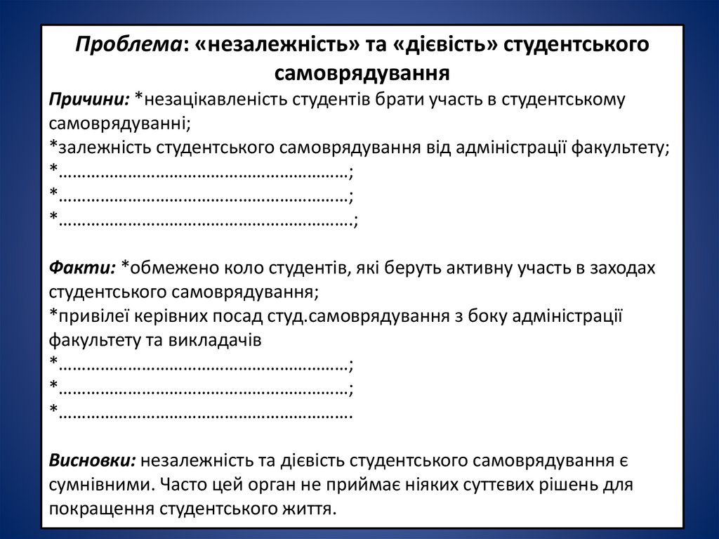 Проблема: «незалежність» та «дієвість» студентськогосамоврядування