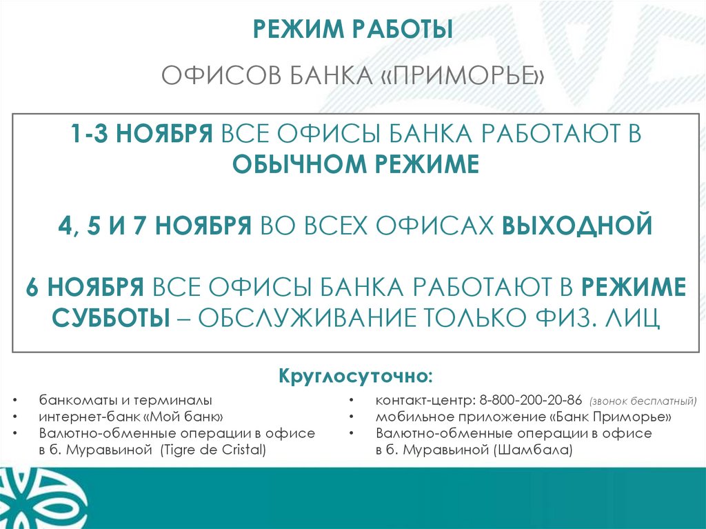 РЕЖИМ РАБОТЫОФИСОВ БАНКА «ПРИМОРЬЕ»
