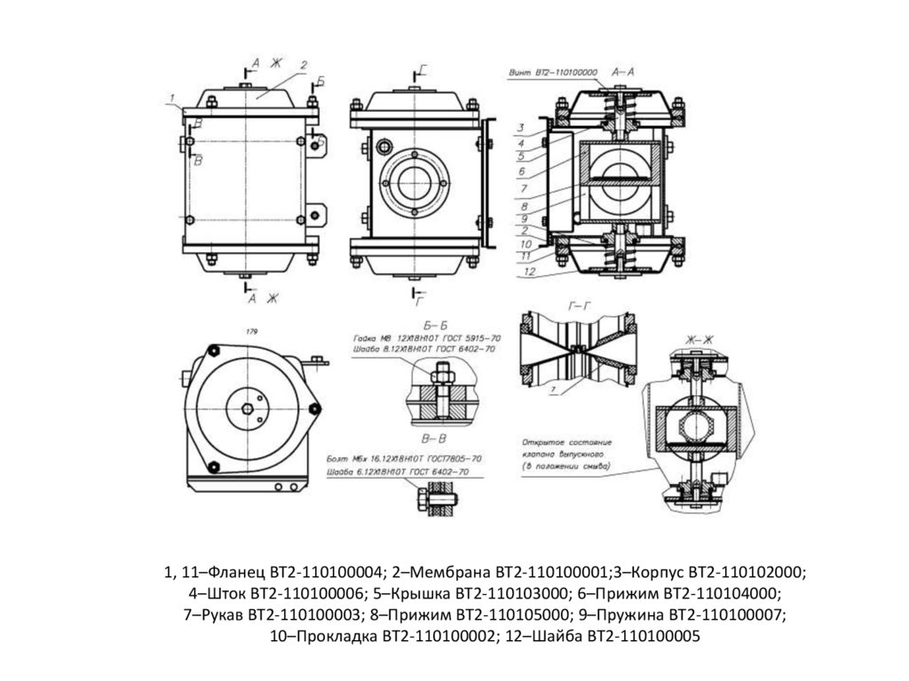 1, 11–Фланец ВТ2-110100004; 2–Мембрана ВТ2-110100001;3–Корпус ВТ2-110102000;4–Шток ВТ2-110100006; 5–Крышка ВТ2-110103000; 6–Прижим ВТ2-110104000;