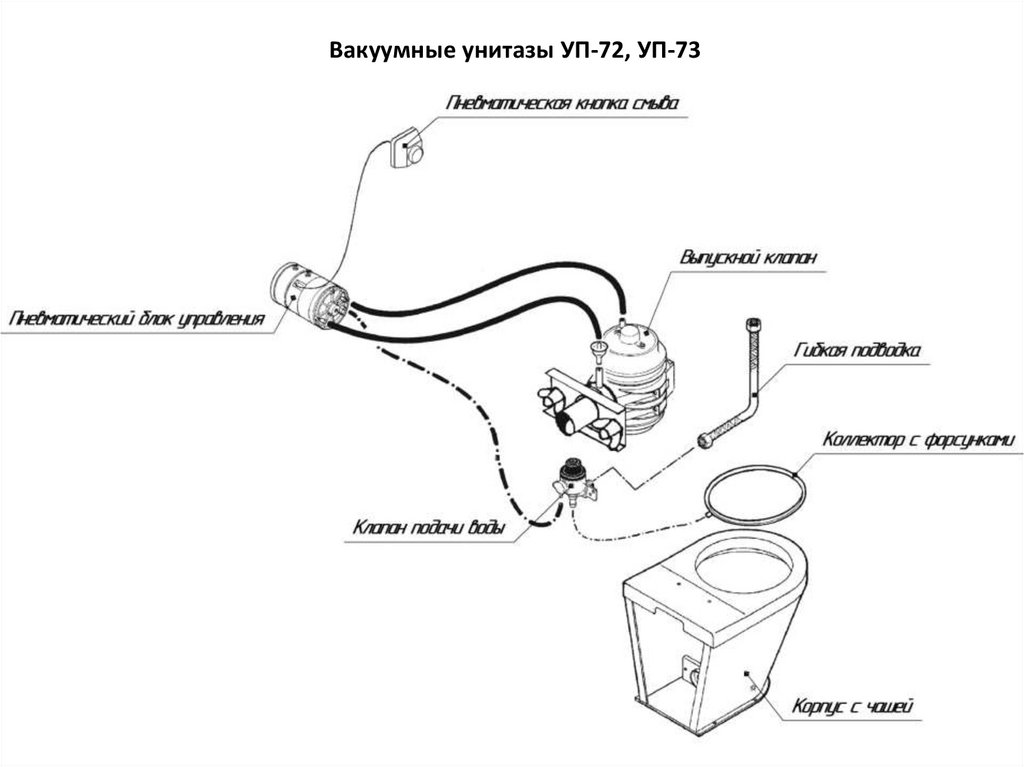Вакуумный унитаз УЭ-71-корпус; 2-крышка корпуса; 3-сиденье с крышкой; 4-коллектор с форсунками;