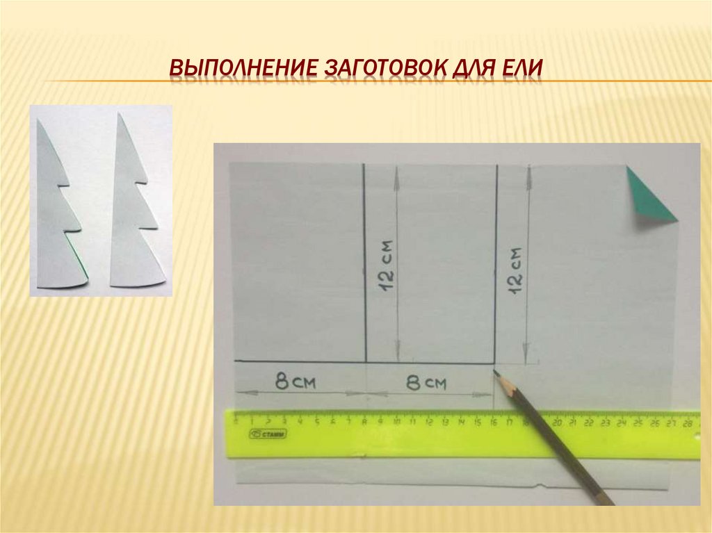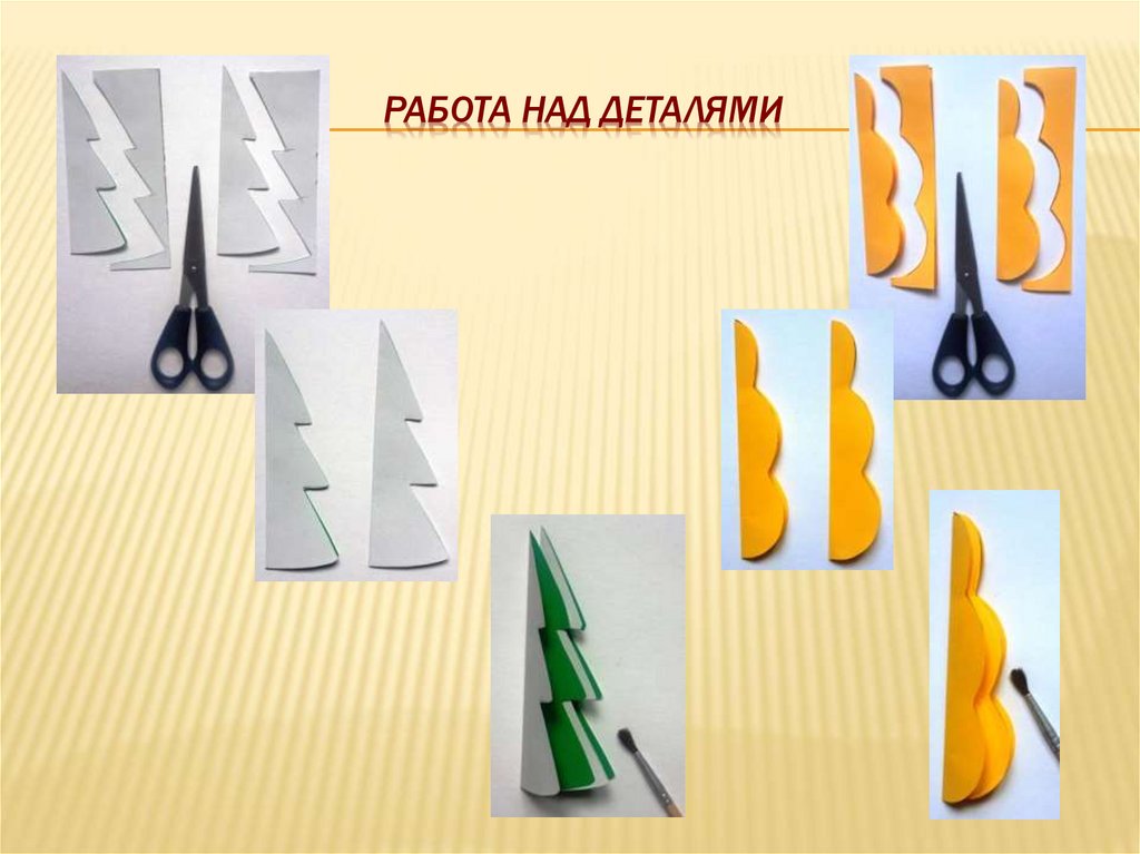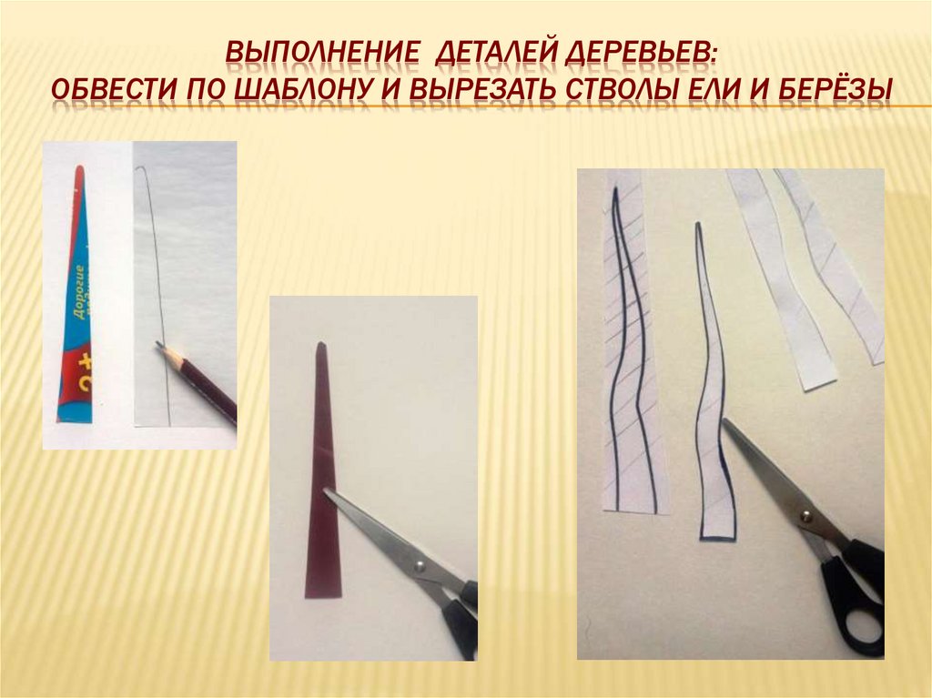 ВЫПОЛНЕНИЕ ДЕТАЛЕЙ ДЕРЕВЬЕВ:ОБВЕСТИ ПО ШАБЛОНУ И ВЫРЕЗАТЬ СТВОЛЫ ЕЛИ И БЕРЁЗЫ