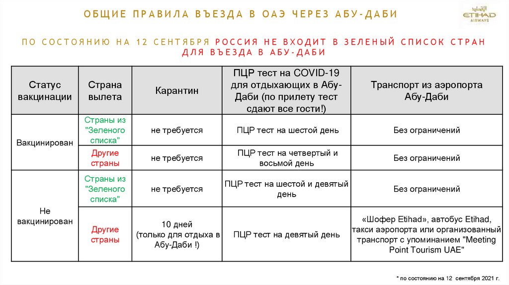ОБЩИЕ ПРАВИЛА ВЪЕЗДА В ОАЭ ЧЕРЕЗ АБУ-ДАБИПО СОСТОЯНИЮ НА 12 СЕНТЯБРЯ РОССИЯ НЕ ВХОДИТ В ЗЕЛЕНЫЙ СПИСОК СТРАН