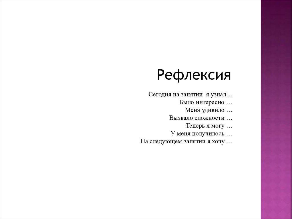 РефлексияСегодня на занятии я узнал…
