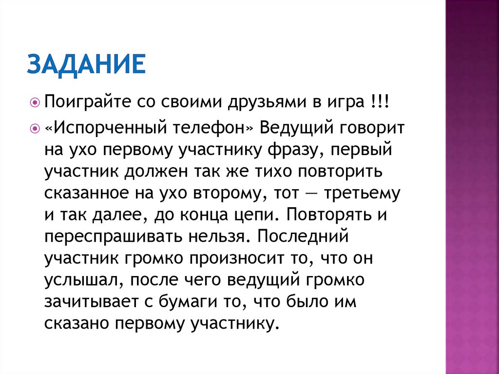 на ухо первому участнику фразу, первый