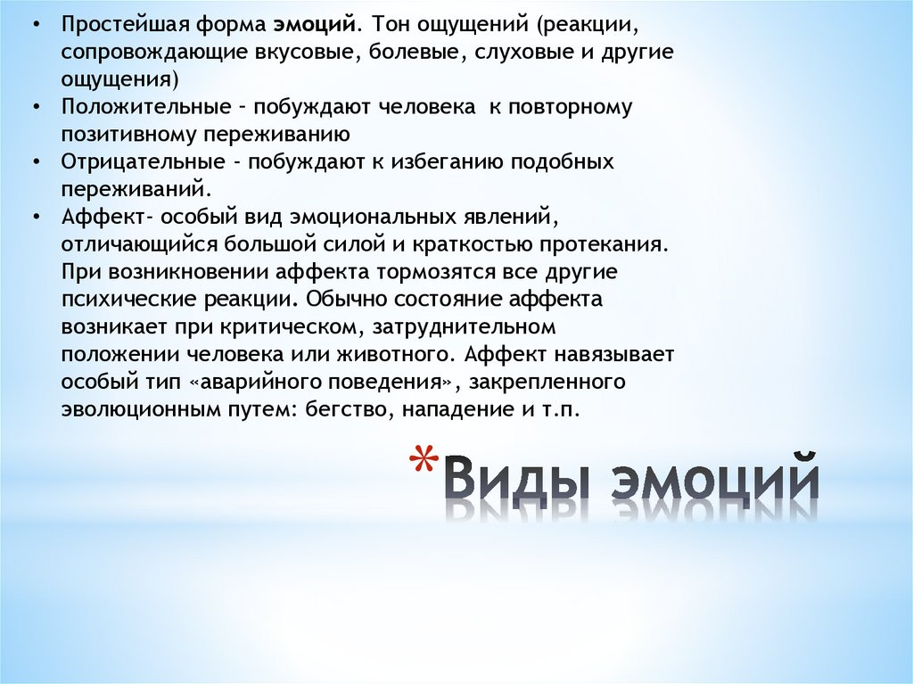 • Простейшая форма эмоций. Тон ощущений (реакции,сопровождающие вкусовые, болевые, слуховые и другие