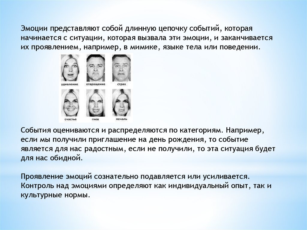 Эмоции представляют собой длинную цепочку событий, котораяначинается с ситуации, которая вызвала эти эмоции, и заканчивается