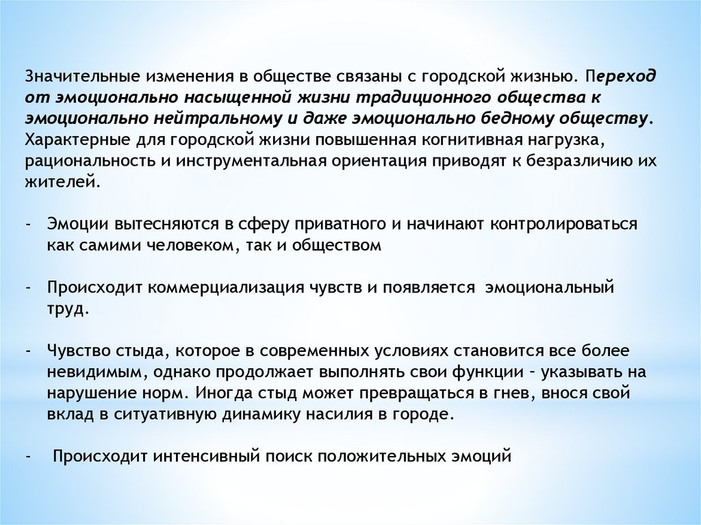 Значительные изменения в обществе связаны с городской жизнью. Переходот эмоционально насыщенной жизни традиционного общества к