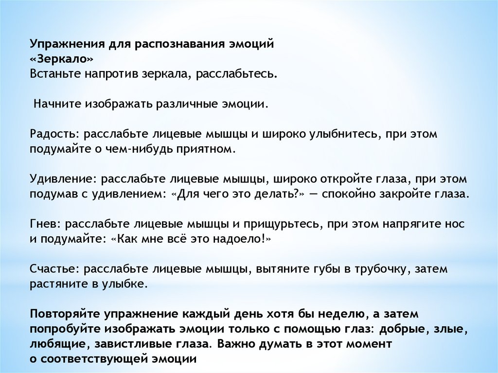 попробуйте изображать эмоции только с помощью глаз: добрые, злые,