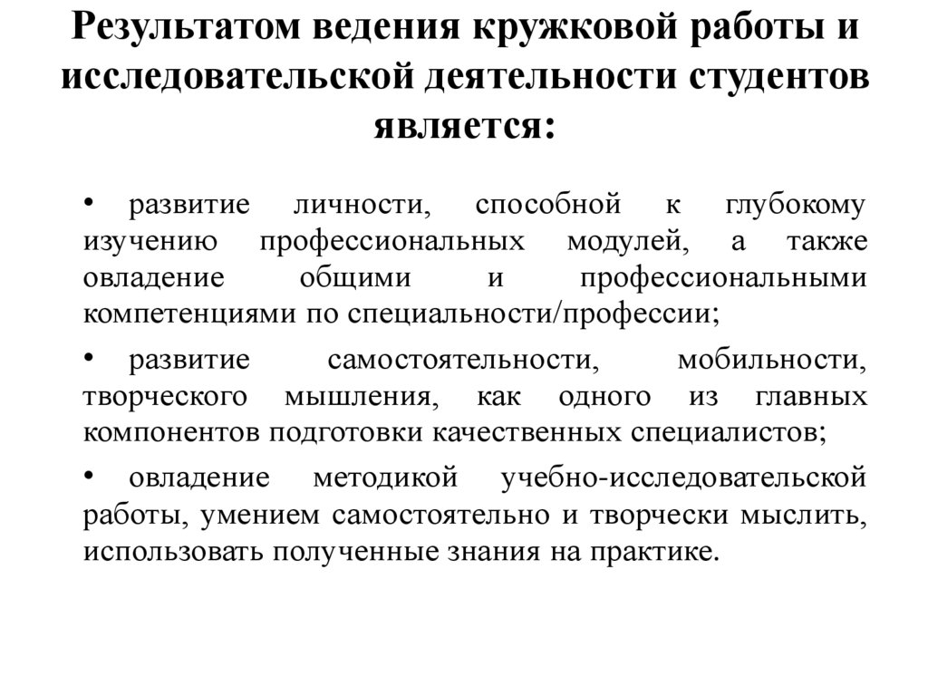 Результатом ведения кружковой работы иисследовательской деятельности студентов