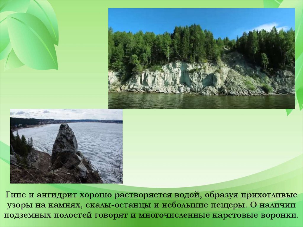 Гипс и ангидрит хорошо растворяется водой, образуя прихотливыеузоры на камнях, скалы-останцы и небольшие пещеры. О наличии