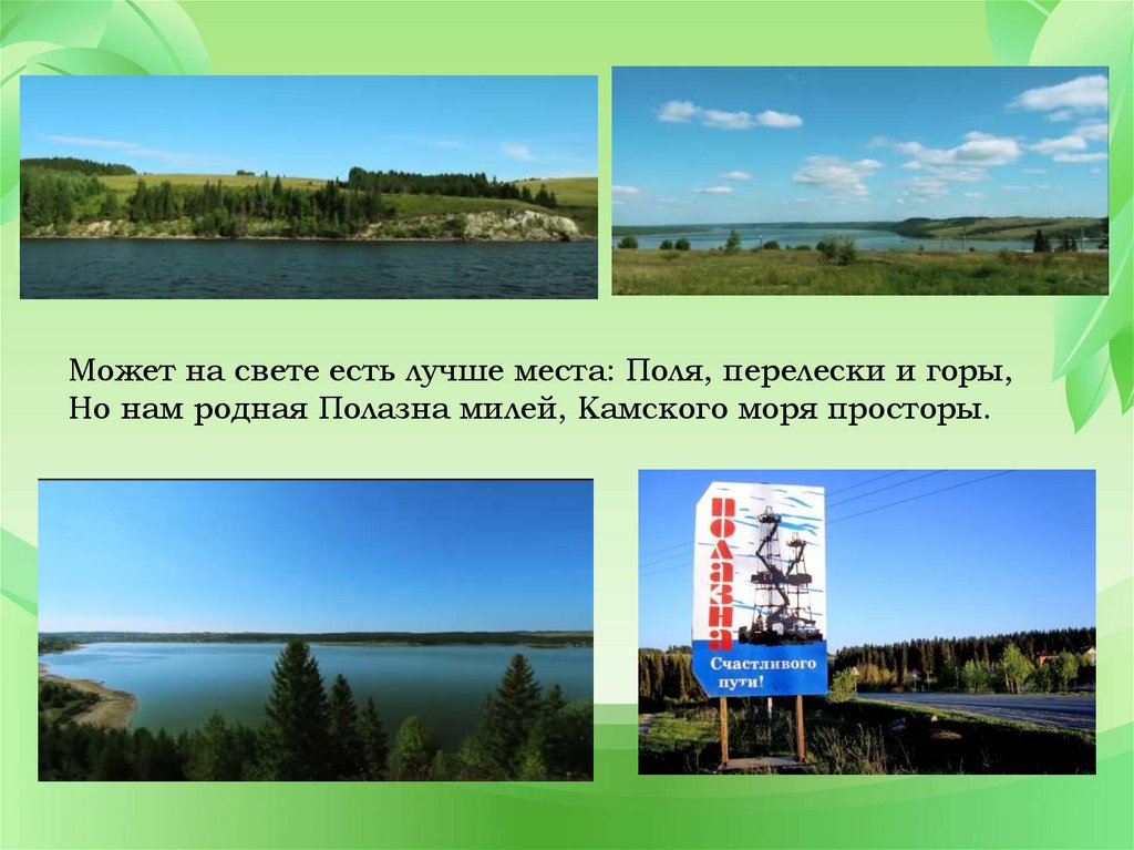 Может на свете есть лучше места: Поля, перелески и горы,Но нам родная Полазна милей, Камского моря просторы.