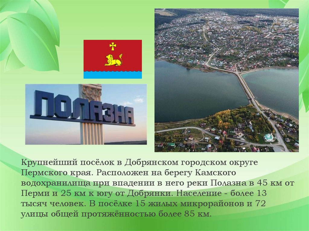 Крупнейший посёлок в Добрянском городском округеПермского края. Расположен на берегу Камского