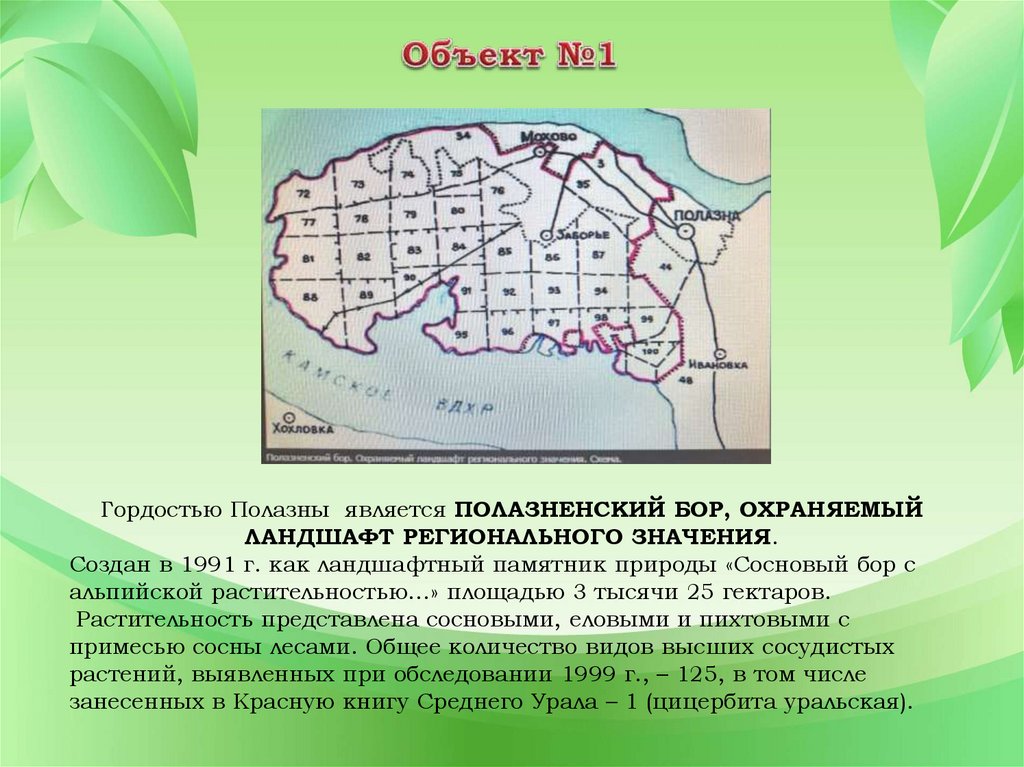 Гордостью Полазны является ПОЛАЗНЕНСКИЙ БОР, ОХРАНЯЕМЫЙЛАНДШАФТ РЕГИОНАЛЬНОГО ЗНАЧЕНИЯ.