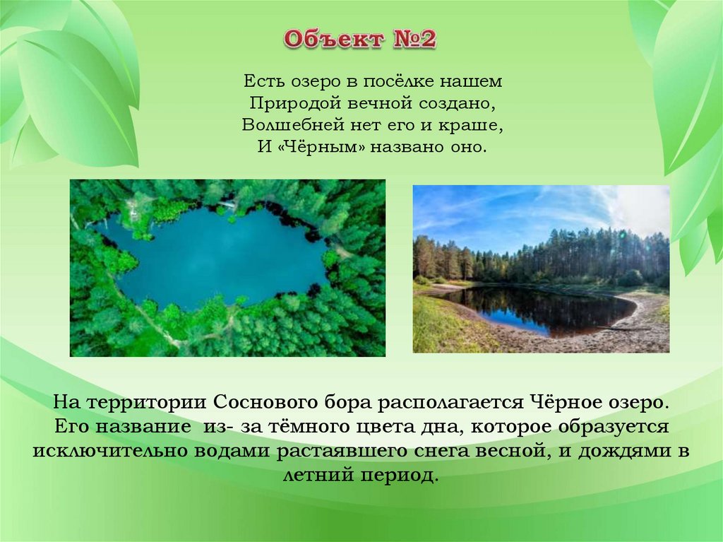 На территории Соснового бора располагается Чёрное озеро.