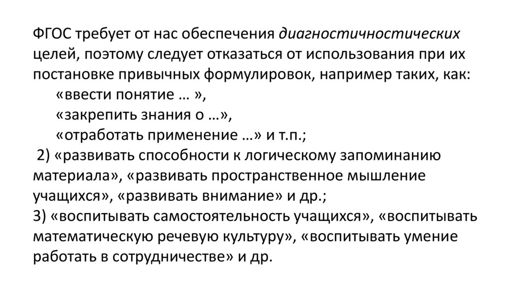 ФГОС требует от нас обеспечения диагностичностическихцелей, поэтому следует отказаться от использования при их