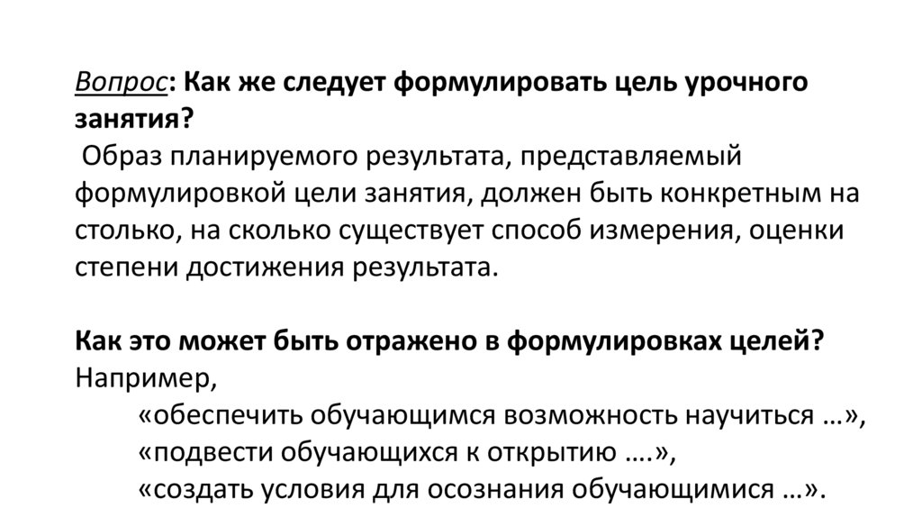 Вопрос: Как же следует формулировать цель урочногозанятия?