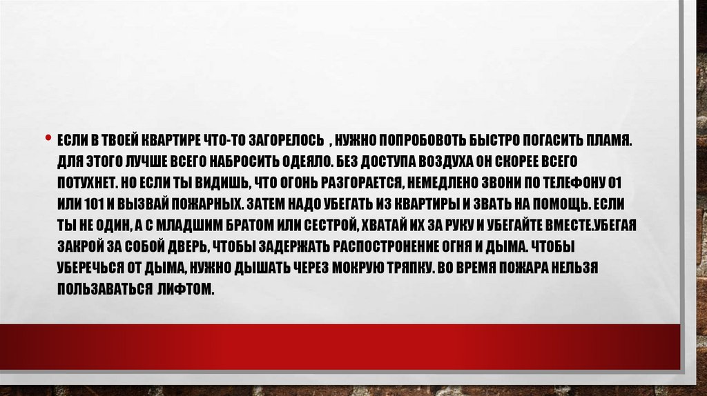 • ЕСЛИ В ТВОЕЙ КВАРТИРЕ ЧТО-ТО ЗАГОРЕЛОСЬ , НУЖНО ПОПРОБОВОТЬ БЫСТРО ПОГАСИТЬ ПЛАМЯ.ДЛЯ ЭТОГО ЛУЧШЕ ВСЕГО НАБРОСИТЬ ОДЕЯЛО. БЕЗ ДОСТУПА ВОЗДУХА ОН СКОРЕЕ ВСЕГО
