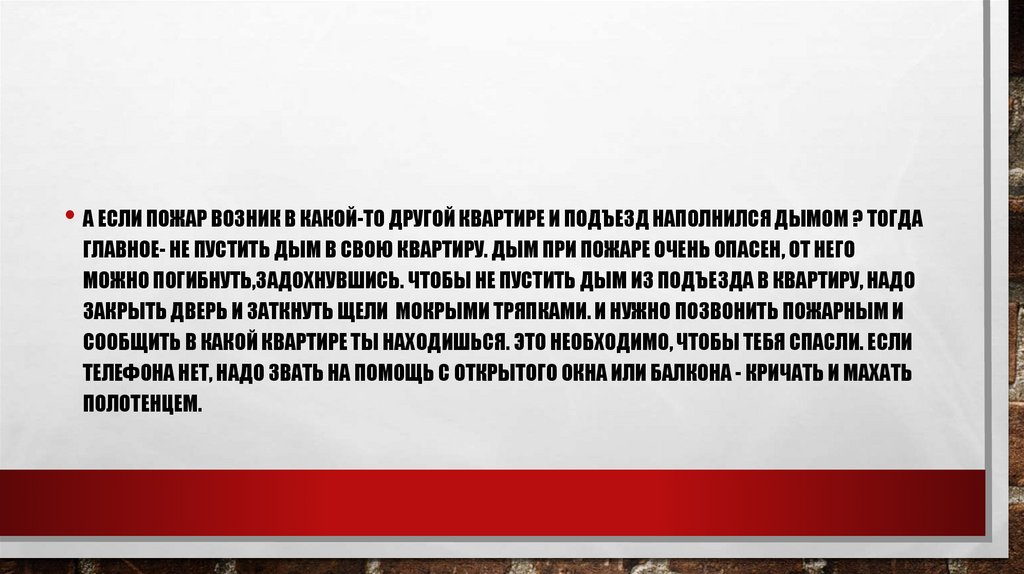 • А ЕСЛИ ПОЖАР ВОЗНИК В КАКОЙ-ТО ДРУГОЙ КВАРТИРЕ И ПОДЪЕЗД НАПОЛНИЛСЯ ДЫМОМ ? ТОГДАГЛАВНОЕ- НЕ ПУСТИТЬ ДЫМ В СВОЮ КВАРТИРУ. ДЫМ ПРИ ПОЖАРЕ ОЧЕНЬ ОПАСЕН, ОТ НЕГО