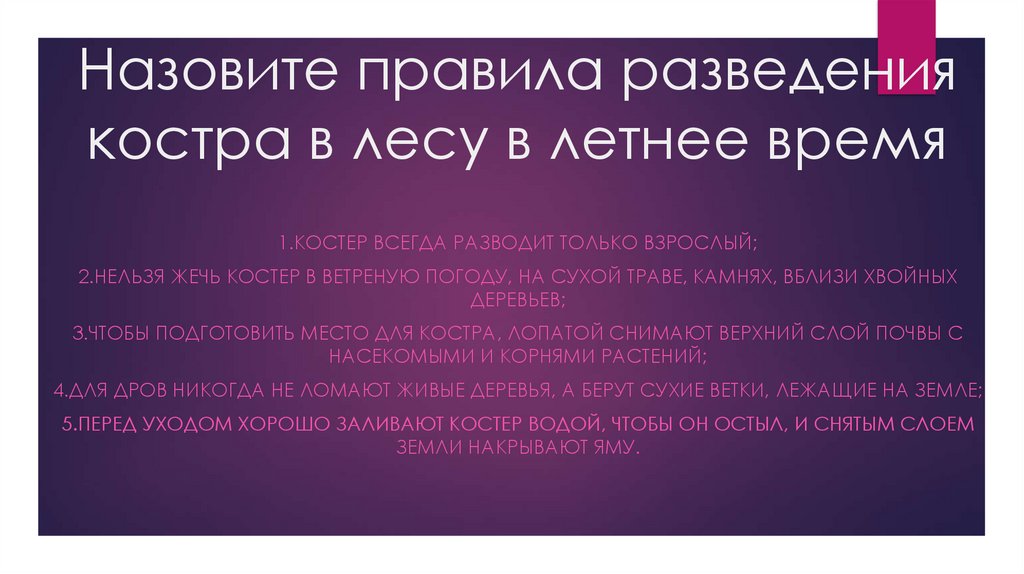 2.НЕЛЬЗЯ ЖЕЧЬ КОСТЕР В ВЕТРЕНУЮ ПОГОДУ, НА СУХОЙ ТРАВЕ, КАМНЯХ, ВБЛИЗИ ХВОЙНЫХ