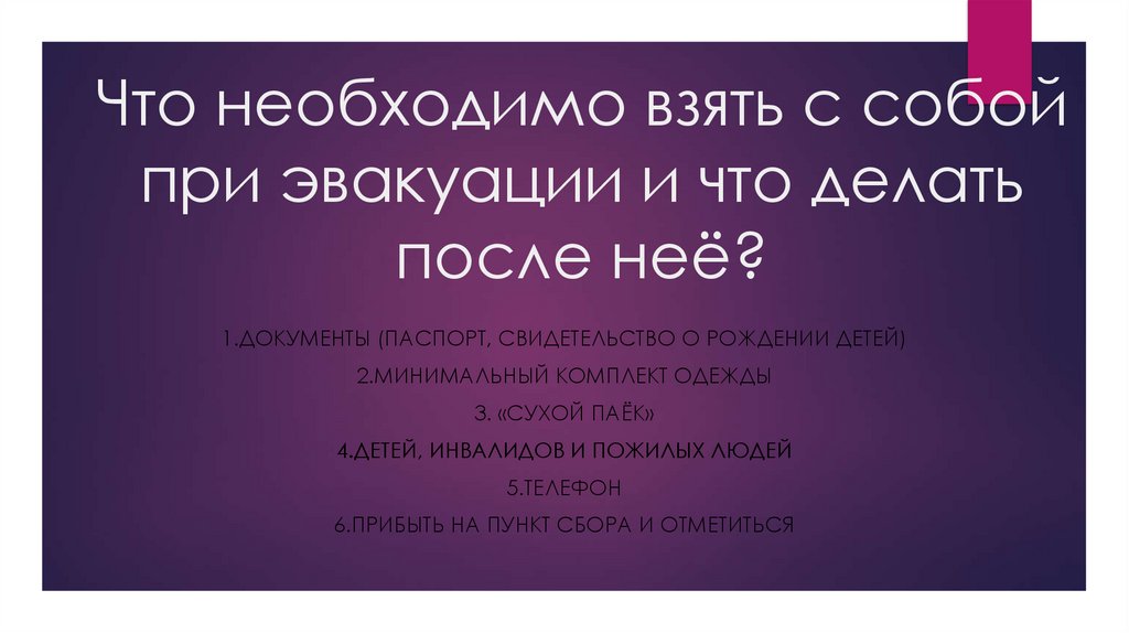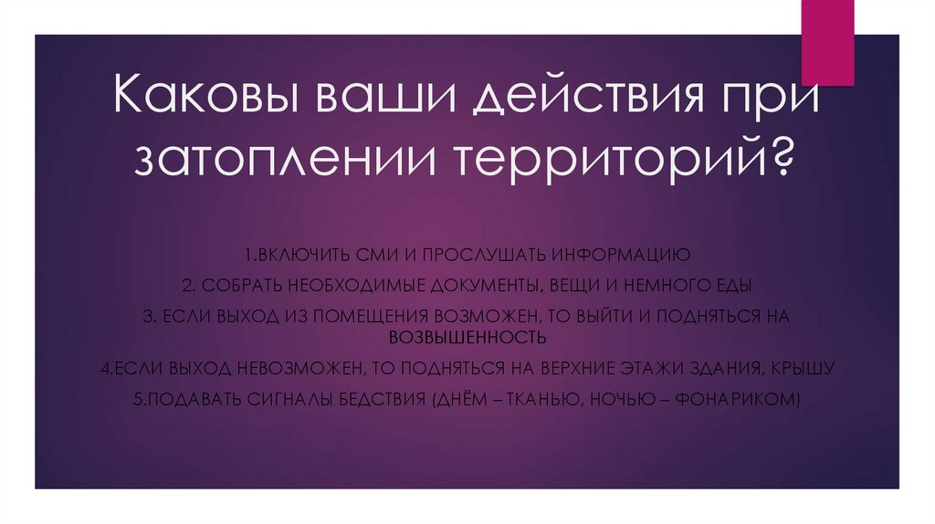 1.ВКЛЮЧИТЬ ТЕЛЕВИЗОР ИЛИ РАДИО И ПРОСЛУШАТЬ ИНФОРМАЦИЮ ПО ОПОВЕЩЕНИЮ