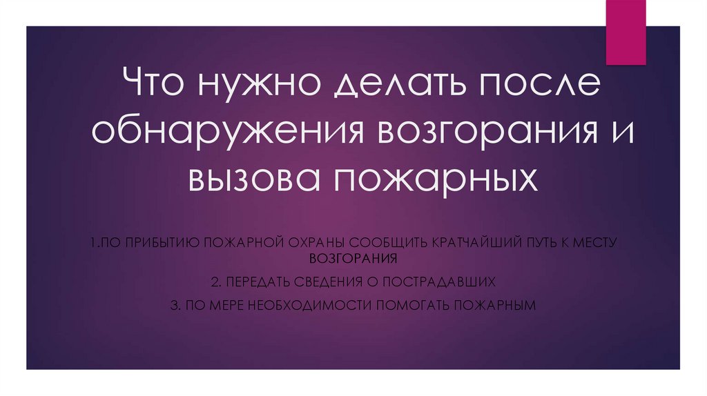 1.ПО ПРИБЫТИЮ ПОЖАРНОЙ ОХРАНЫ СООБЩИТЬ КРАТЧАЙШИЙ ПУТЬ К МЕСТУ