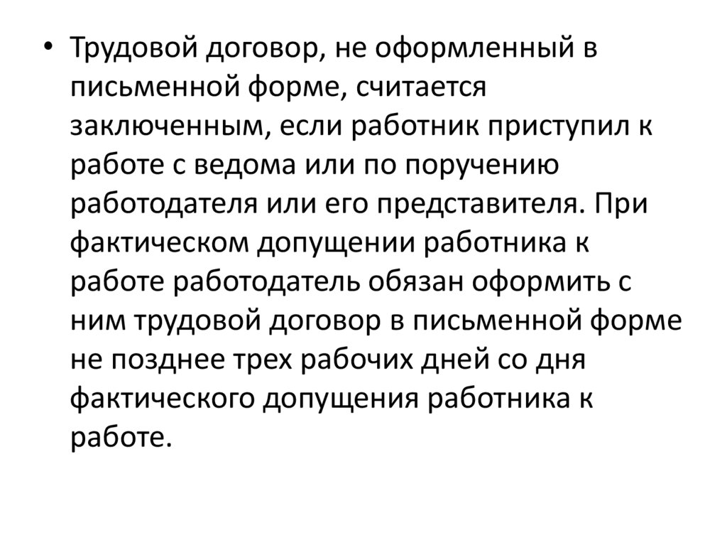 • Трудовой договор, не оформленный вписьменной форме, считается