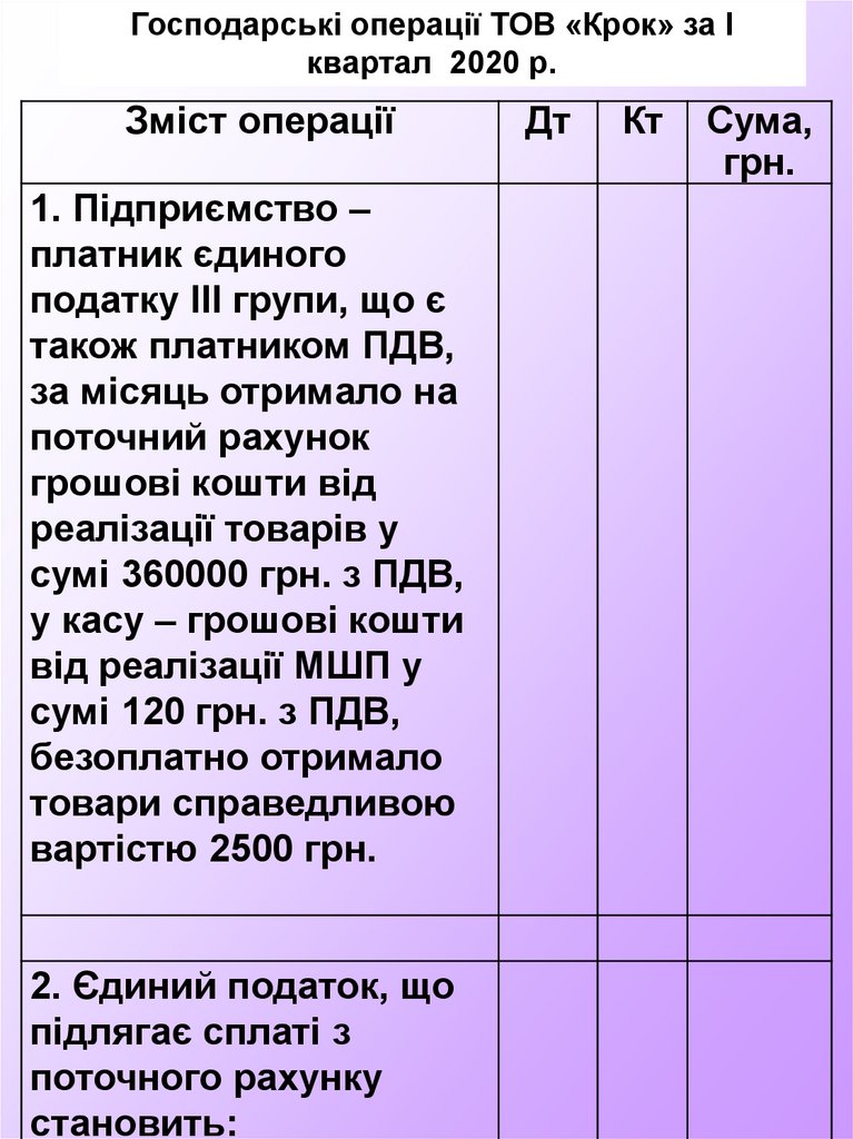 Господарські операції ТОВ «Крок» за Іквартал 2020 р.