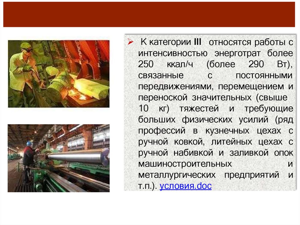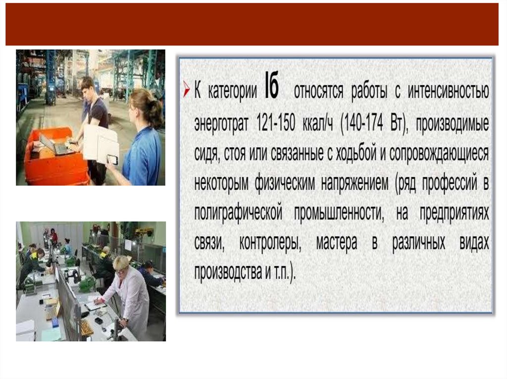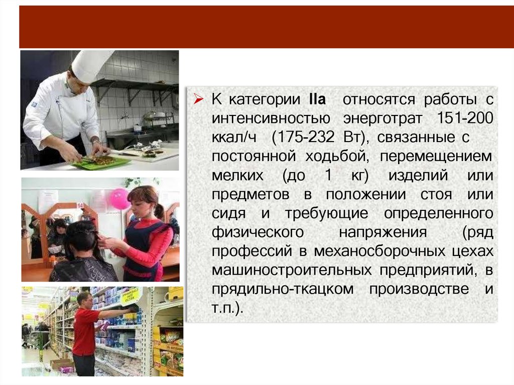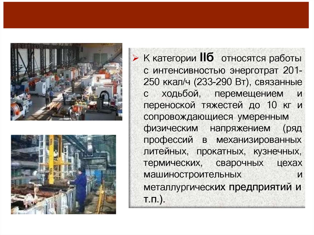 К категории IIб относятся работыс интенсивностью энерготрат 201250 ккал/ч (233-290 Вт), связанные