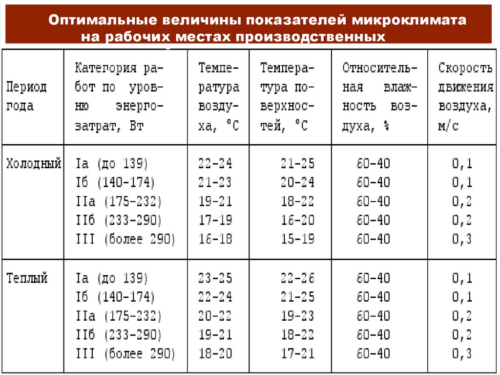 Оптимальные величины показателей микроклиматана рабочих местах производственных