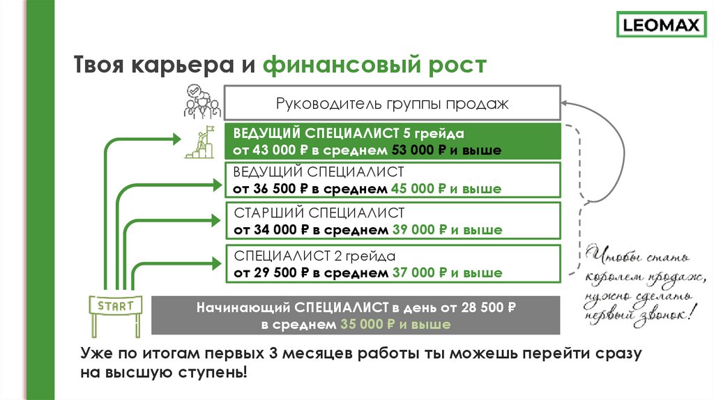 каждые 3 месяца карьерный рост и увеличение дохода;