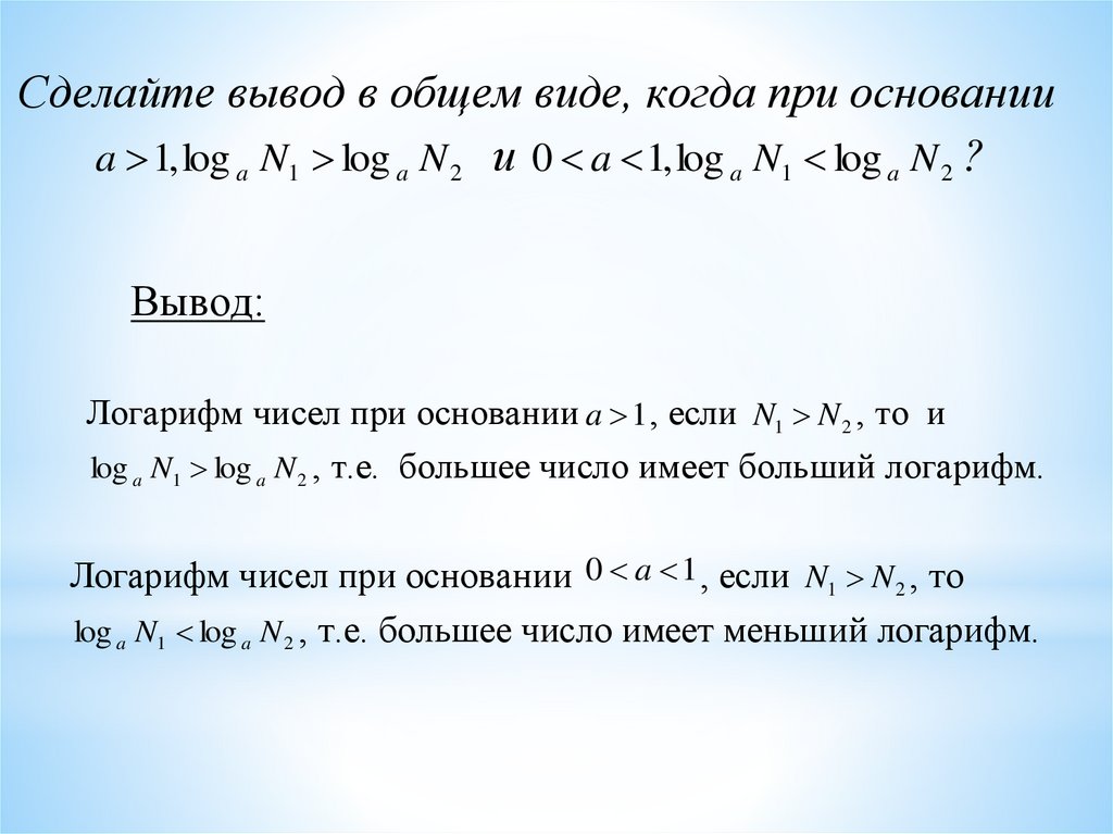 Сделайте вывод в общем виде, когда при основанииa 1, log a N1 log a N 2 и 0 a 1, log a N1 log a N 2 ?