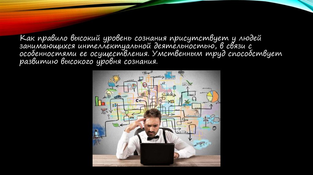 Как правило высокий уровень сознания присутствует у людейзанимающихся интеллектуальной деятельностью, в связи с